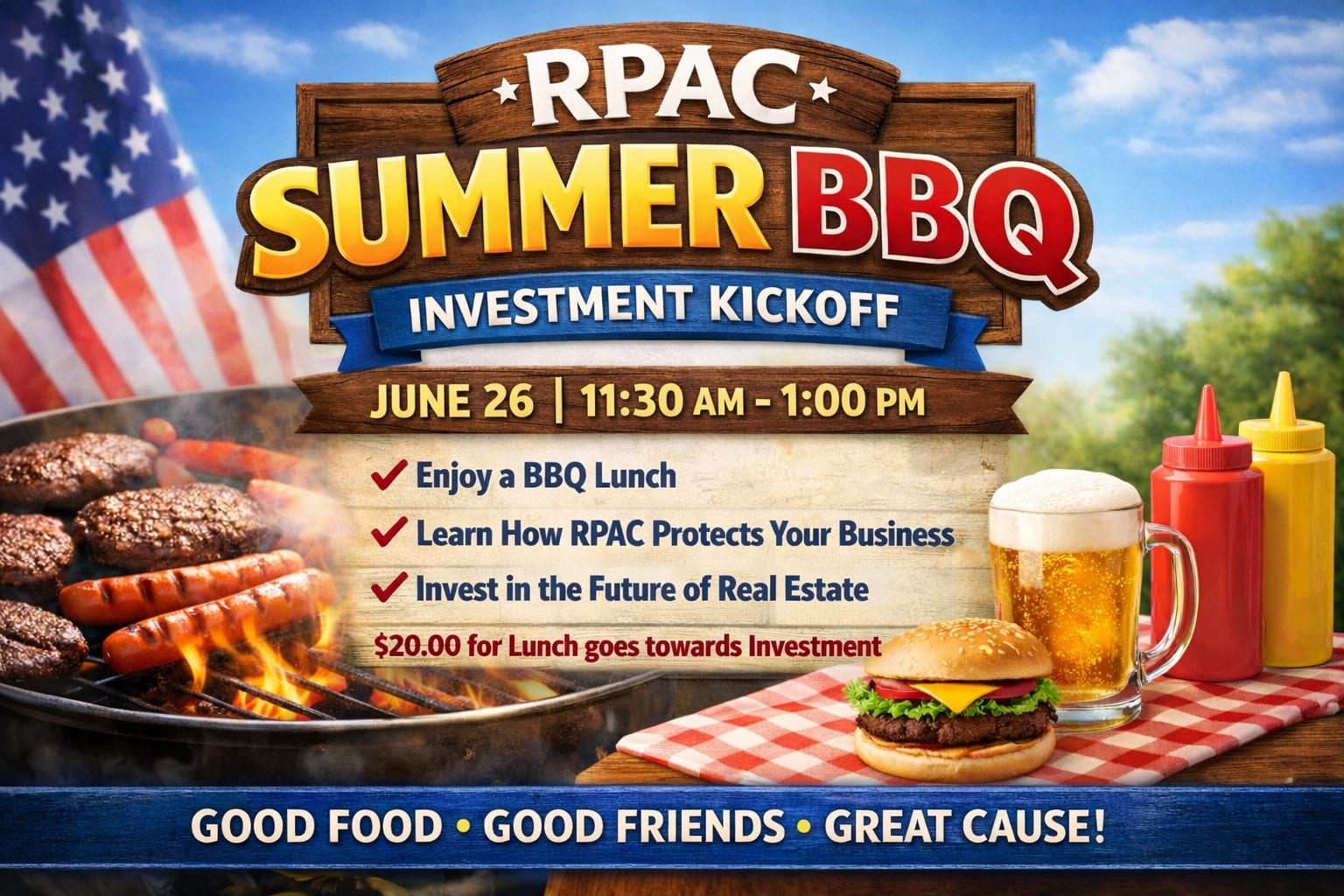 RPAC Summer BBQ Investment Kickoff Fire up the grill and fuel the fight for real estate! ðŸŒðŸ”¥ Join fellow REALTORS® on June 26 from 11:30 AM–1:00 PM for the RPAC Summer BBQ Investment Kickoff. Enjoy a free BBQ lunch, connect with colleagues, and learn how your RPAC investment helps protect private property rights and advocate for our industry. Good food, good people, and a powerful purpose—don’t miss it! RPAC Investment of $20.00 for food and fun!Images
